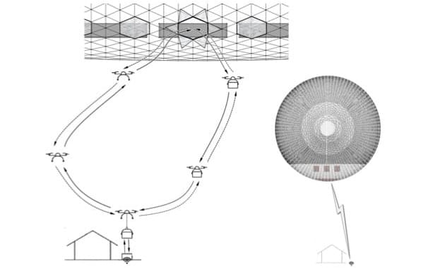 ● the ability to launch drones from a dirigible, allowing the drones to use all on-board energy to lift heavier packages rather than using that same energy to fly to the drop-off or pickup zone, resulting in efficient use of every route;